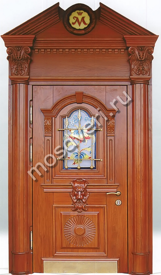 Входная металлическая дверь с отделкой массивом с колонами на доборах — совмещает эстетичность и максимальную защиту.