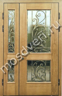 Двустворчатая дверь из массива со стеклом и ковкой — сочетает в себе эстетичность и максимальную защиту.